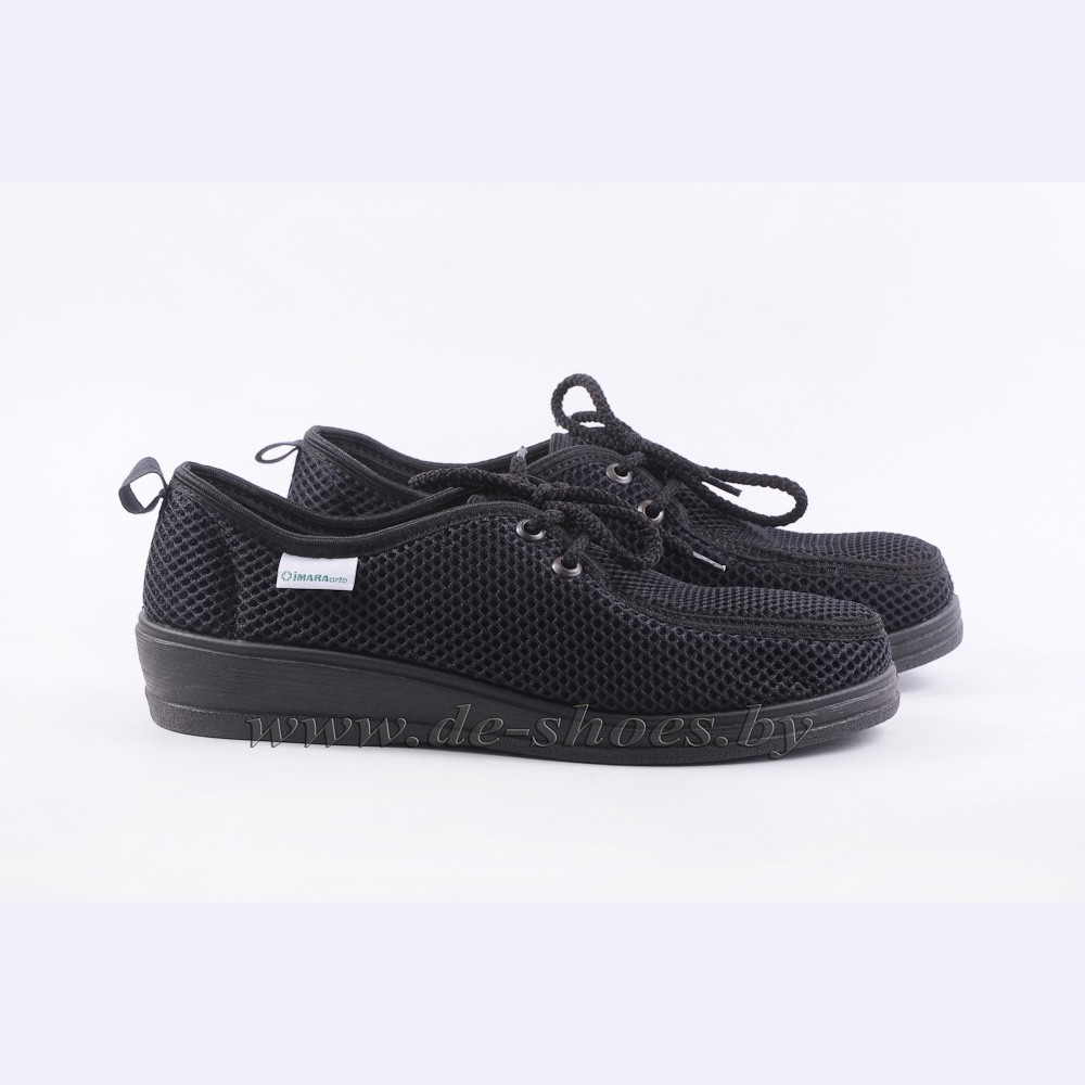 Комфортные женские летние полуботинки на гибкой танкетке от испанского производителя обуви с ортопедическим уклоном Imara . Модель выполнена из дышащего текстиля черного цвета.